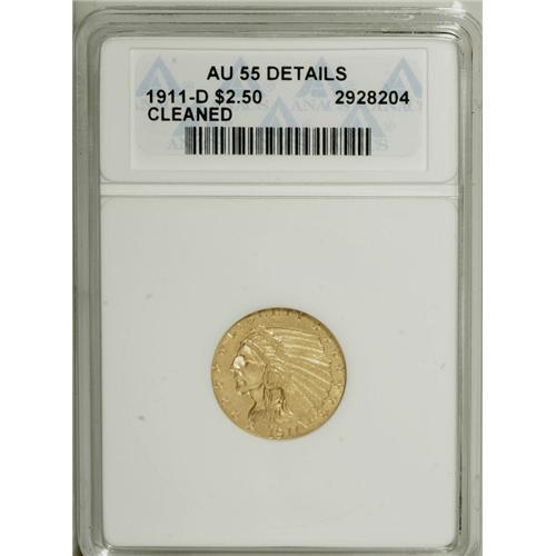 <B>1911-D $2 1/2 --Cleaned--ANACS. AU55 Details.</B></I> Some faint hairlines show up under magnification on the yellow-gold surfaces that display traces of luster. Nice definition is apparent on the design elements, except for softness in the eagle's left (right facing) shoulder feathers. This is a decent example of the key-date to the Indian quarter eagle series; the light cleaning should not intimidate the interested bidder.<BR><BR><b>Shipping:</b> Coins & Currency (<a target="_blank" href="http://www.heritageauctions.com/common/shipping.php">view shipping information</a>)