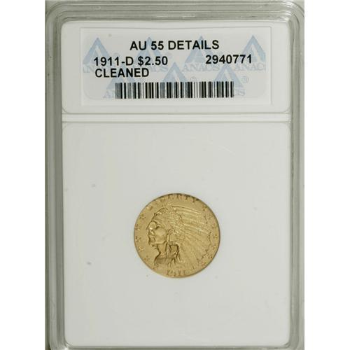 <B>1911-D $2 1/2 --Cleaned--ANACS. AU55 Details.</B></I> The mintmark has low relief but is fully outlined. This lightly polished key date example has a thin mark on the base of the portrait, but would complete the Indian quarter eagle sets of many gold collectors.<BR><I>From The Twin Hollows Collection, Part Two.</B></I><BR><BR><b>Shipping:</b> Coins & Currency (<a target="_blank" href="http://www.heritageauctions.com/common/shipping.php">view shipping information</a>)