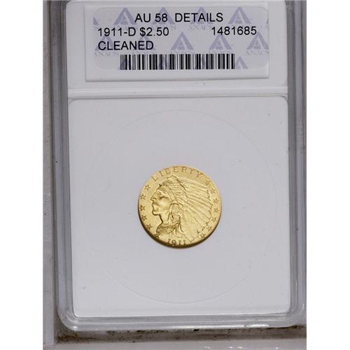 <B>1911-D<$2 1/2>--Cleaned--ANACS. AU58 Details.</B></I> The light wear is visible on the eagle's wingtips and the Indian's cheek. Despite the ANACS caveat, the surfaces are appealing, with green-gold color and minimal abrasions. An affordable example of this always-popular key date issue. <BR><BR><B>Important notice:</B> Heritage usually auctions material at the rate of 200-250 lots per hour. On some occasions eBay Live bid software or the Internet may not be able to keep up with the pace of the auction. We recommend placing a realistic absentee bid now as insurance to avoid disappointment. Occasionally the auctioneer may eliminate or reject an eBay Live bid, and the auctioneer may also reopen a lot after the close of the eBay live bidding (usually because we missed an audience bid), and may reject your bid even if it shows you as the winning bidder. By bidding via eBay Live, you agree that Heritage may award the lot to another bidder at its sole discretion under the circumstances described above or any other reasonable circumstances. Since eBay bids are not shown to us until we open the lot on the floor, we treat those bids just like floor bids. In most cases the floor responds before the eBay bid is presented to us, due to Internet lag time, so for consistency we have made it a policy that floor bids are always considered first over tie eBay live bids. Also please note that all Heritage lots purchased through eBay Live carry a 20% Buyer's Premium. Please make sure you read the Terms and Conditions before you bid. This lot is being auctioned in conjunction with a live floor auction by Heritage Galleries & Auctioneers. All final auction and invoice information will be supplied by Heritage Galleries & Auctioneers, and all other information should be considered preliminary. Lot:2483 <BR><BR><B>Winning Notification and Billing:</B> After the FINAL session in this auction is complete, Heritage will send e-mail and snail mail invoices. This process normally takes several days. All final auction and invoice information will be supplied by Heritage Galleries & Auctioneers, and all other information should be considered preliminary. <BR><BR>This auction will be conducted on a live auction floor and over the Internet through eBay Live. If you choose to place an absentee bid, please take a moment to <font color='#0000ff'><u><a href='http://pages.ebay.com/liveauctions/help/before/laabsentee.html'>learn how eBay Live absentee bidding works</a></u></font><font color='#000000'>
