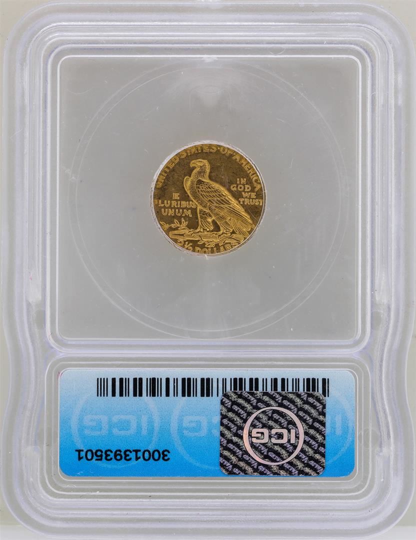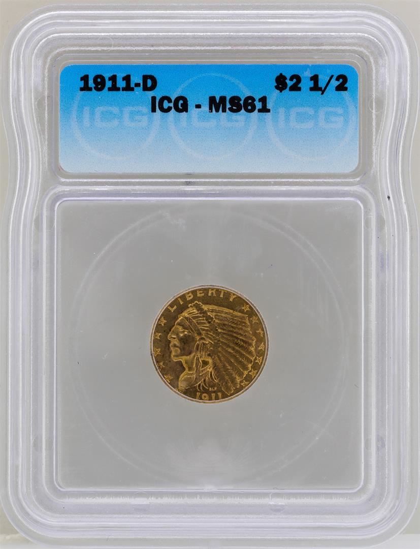 One 1911-D $2 1/2 Indian Head Quarter Eagle Gold Coin ICG MS61. ICG Certified.