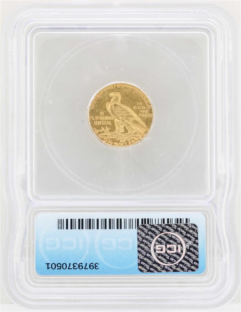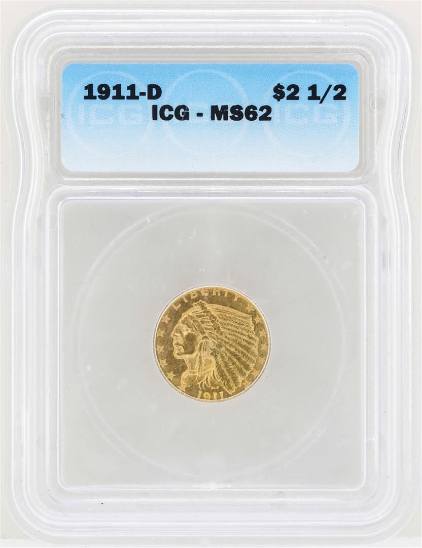 One 1911-D $2 1/2 Indian Head Quarter Eagle Gold Coin ICG MS62. ICG Certified.