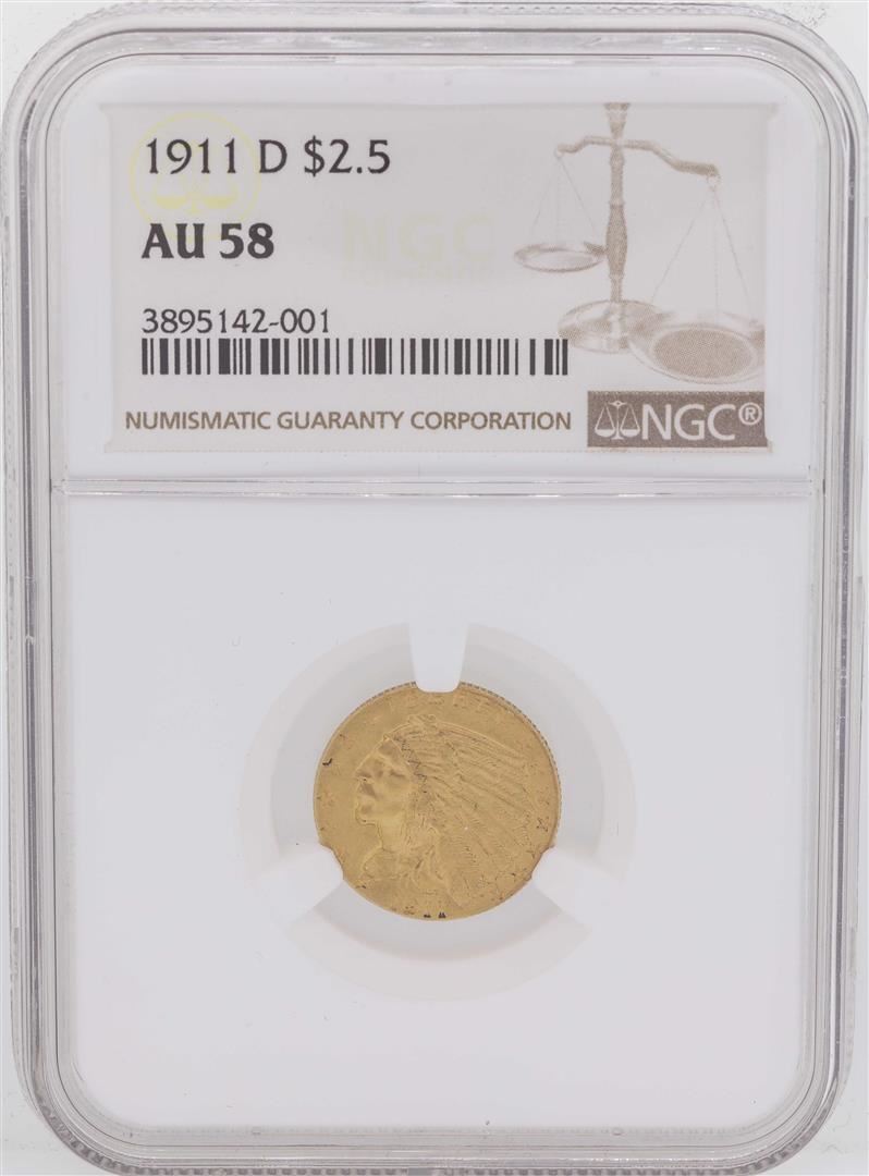 One 1911-D $2 1/2 Indian Head Quarter Eagle Gold Coin NGC AU58. NGC Certified.