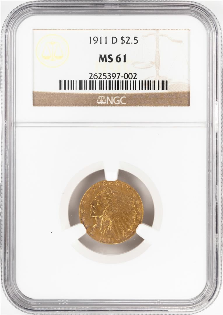 One 1911-D $2 1/2 Indian Head Quarter Eagle Gold Coin NGC MS61. NGC Certified.