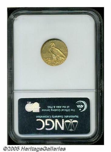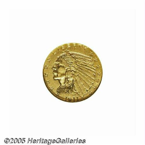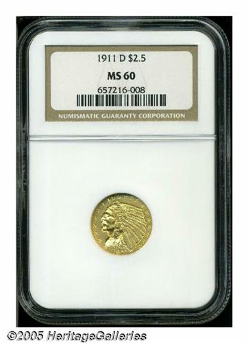 <B>1911-D<$2 1/2> MS60 NGC.</B></I> Some notable flatness and stacking friction does not reduce the beauty of the otherwise attractive example. The devices retain significant luster. The 1911-D has long been recognized as the key date to the series, as the mintage is multiples lower than the next scarcest issue, the 1914.