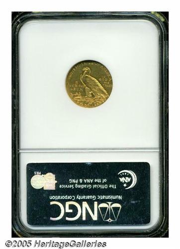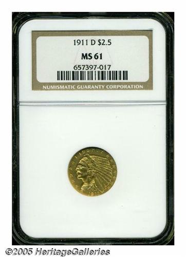 <B>1911-D<$2 1/2> MS61 NGC.</B></I> This D-mint issue saw widespread circulation despite a limited original mintage of only 55,600 pieces. An understandably scarce coin in all Mint State grades, the present BU survivor is free of most abrasions, the most noticeable being on the reverse. Both sides are honey-gold in color with above average striking definition for the series. Although somewhat lackluster, this coin would be a worthwhile addition to any Mint State gold collection.