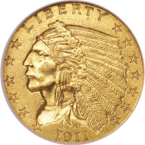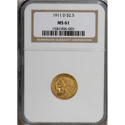 <B>1911-D $2 1/2 MS61 NGC.</B></I> The Denver mintmark is bold on this satiny and expertly struck key date quarter eagle. For the MS61 grade, the fields and devices are surprisingly void of marks, and the eye appeal is imposing. The Indian quarter eagle series is collectible, which focuses demand on low mintage issues such as the 1911-D and the 1914.<BR><BR><B>Coin Engraver:</B> Bela Lyon Pratt<BR><BR><b>Shipping:</b> Coins & Currency (<a target="_blank" href="http://www.heritageauctions.com/common/shipping.php">view shipping information</a>\)