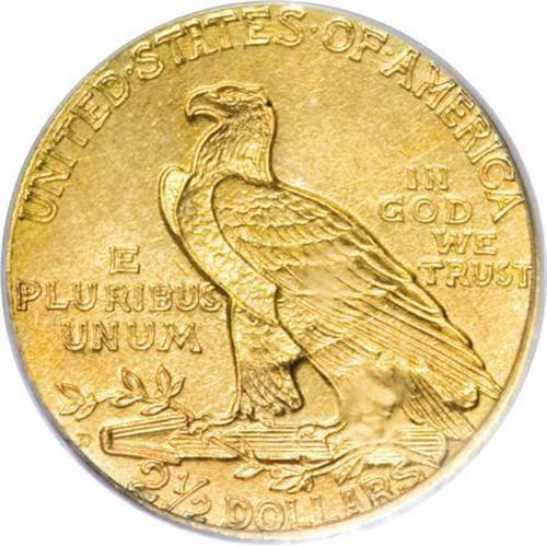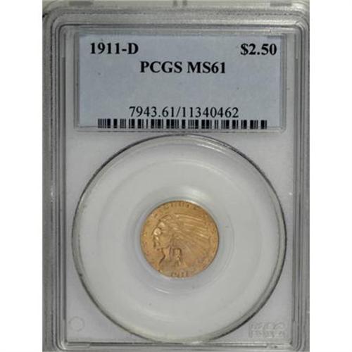 <B>1911-D $2 1/2 MS61 PCGS.</B></I> This satiny piece has an appealing matte-like appearance, along with satin luster and a mixture of khaki and champagne-red coloration. The design elements are boldly detailed. The only notable distraction is a pinscratch that extends from between ER in AMERICA to the edge of the eagle's wing. This is the undisputed key date to the series, and examples are hotly pursued at any grade level. <BR><BR><B>Coin Engraver:</B> Bela Lyon Pratt<BR><BR><b>Shipping:</b> Coins & Currency (<a target="_blank" href="http://www.heritageauctions.com/common/shipping.php">view shipping information</a>)