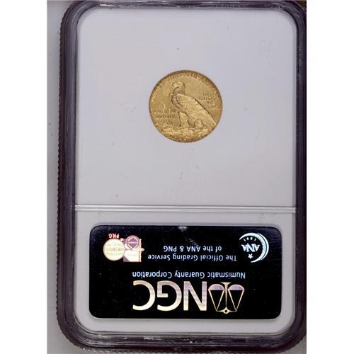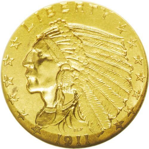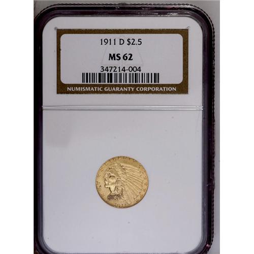 <B>1911-D<$2 1/2> MS62 NGC.</B></I> Some examples of this important 20th century gold issue are so poorly impressed that the all-important D mintmark is not discernible. The present example, on the other hand, is boldly detailed throughout with a readily evident mintmark. Both sides are a medium yellow-gold, although select angles reveal delicate tan-gold overtones here and there. There are few abrasions of any size, an uncommon feature for an Indian quarter eagle at the BU level, and certainly none that are worthy of special consideration. The 1911-D records the lowest mintage (55,680 pieces) in this series, and it is the undisputed key.