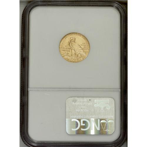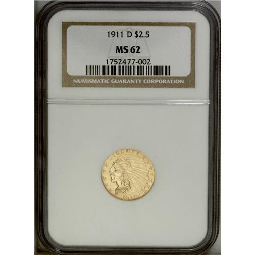 <B>1911-D $2 1/2 MS62 NGC.</B></I> The 1911-D is the key to the Indian Head quarter eagle series in all grades. Its 55,680-piece mintage is the lowest of the series, and few examples were saved at the time of issue. Most of the survivors are in the AU to lower Mint State range. High-end Uncirculated examples are scarce to rare.<BR> The MS62 coin presented in the current lot displays bright brassy-gold surfaces, and the design elements are generally well defined, including the D mintmark. A few wispy handling marks are noted on each side, none of which are serious. All in all, this piece exhibits nice eye appeal for the grade.<BR><BR><b>Shipping:</b> Coin/Currency (<a target="_blank" href="http://www.heritageauctions.com/common/shipping.php">view shipping information</a>)