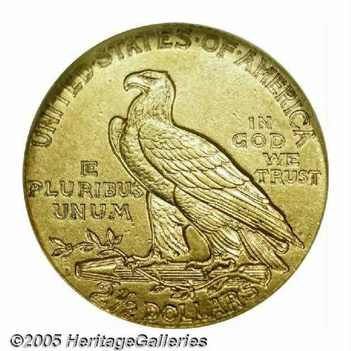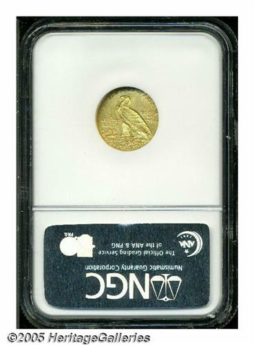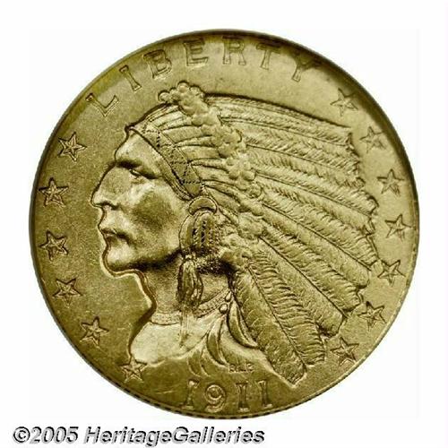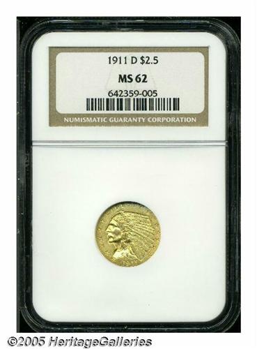 <B>1911-D<$2 1/2> MS62 NGC.</B></I> This issue is the single key-date among Indian Quarter Eagles, and it is always in demand. In fact, the last couple years has seen a substantially heightened demand for the date, and today, examples are seldom available. This example is especially desirable for its complete and bold mintmark. So many examples of this date have extremely weak, or in some cases invisible, mintmarks. Other die characteristics must be studied to identify those coins as products of the Denver Mint. In the case of this coin, no such study is needed. All of the design features on both sides are nicely defined. The surfaces have attractive yellow-gold color with satiny luster. Overall, this is an extremely desirable example of the date.