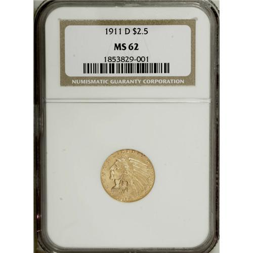 <B>1911-D $2 1/2 MS62 NGC.</B></I> This key-date representative exhibits bright brass-gold, lustrous surfaces. An impressive strike is manifested in strong definition on the Indian's face, in most of the hair at the temple, on the feathers of the bonnet, and in the eagle's plumage, though the shoulder feathers are soft, as is the mintmark. Light handling marks on the cheek and in the upper reverse field help to determine the grade. The 1911-D becomes more difficult to acquire in the higher levels of Mint State. According to Jeff Garrett and Ron Guth (2006), relatively few pieces of the 55,680-piece mintage were saved at the time of issue.<BR><BR><b>Shipping:</b> Coin/Currency (<a target="_blank" href="http://www.heritageauctions.com/common/shipping.php">view shipping information</a>)