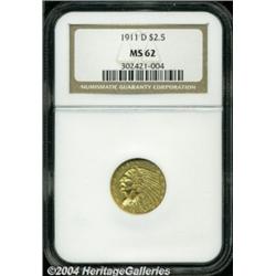 <B>1911-D<$2 1/2> MS62 NGC.</B></I> With an original mintage of just 55,680 pieces, the 1911-D has long been considered the key to this very collectible and quite affordable series. More often seen in XF or AU condition, this issue is scarce in Mint State grades. This solid example has bright golden luster and is well struck. The MS62 grade was apparently assigned because of a number of light, scattered abrasions (none of which are serious) that are visible under magnification. This specimen boasts a strong mint mark. <BR><BR><B>Important notice:</B> Heritage usually auctions material at the rate of 200-250 lots per hour. On some occasions eBay Live bid software or the Internet may not be able to keep up with the pace of the auction. We recommend placing a realistic absentee bid now as insurance to avoid disappointment. Occasionally the auctioneer may eliminate or reject an eBay Live bid, and the auctioneer may also reopen a lot after the close of the eBay live bidding (usually because we missed an audience bid), and may reject your bid even if it shows you as the winning bidder. By bidding via eBay Live, you agree that Heritage may award the lot to another bidder at its sole discretion under the circumstances described above or any other reasonable circumstances. Since eBay bids are not shown to us until we open the lot on the floor, we treat those bids just like floor bids. In most cases the floor responds before the eBay bid is presented to us, due to Internet lag time, so for consistency we have made it a policy that floor bids are always considered first over tie eBay live bids. Also please note that all Heritage lots purchased through eBay Live carry a 20% Buyer's Premium. Please make sure you read the Terms and Conditions before you bid. </span></font></tr></table></td></tr></table>