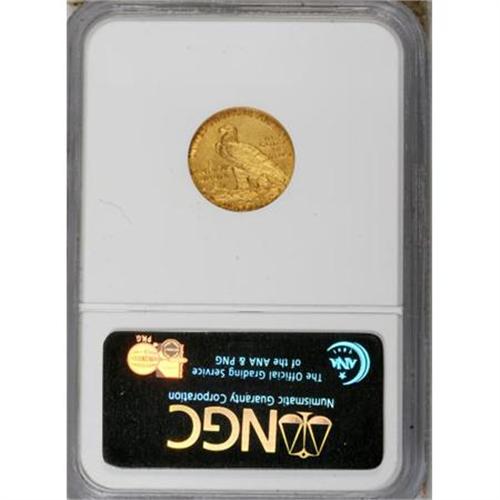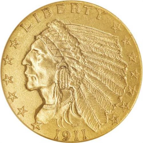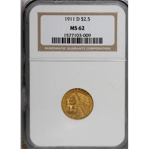 <B>1911-D $2 1/2 MS62 NGC.</B></I> The 1911-D is a noteworthy key for the Indian quarter eagle series, not only for its status as the lowest-mintage issue but for the distance between its production and that of the next-lowest issue. With just 55,680 pieces struck, the 1911-D has a mintage less than one-quarter that of the 1914, a sizable gap.<BR> This subtly lustrous example's lightly abraded surfaces are a particularly vibrant shade of butter-yellow. The devices are boldly impressed, even the three pendants on the obverse, and the overall eye appeal is substantial for the grade. Numismatists who are beginning a date set often are encouraged to purchase the key date first, and for the well-heeled collector interested in the series, this 1911-D quarter eagle would make an excellent cornerstone.<BR><BR><B>Coin Engraver:</B> Bela Lyon Pratt<BR><BR><b>Shipping:</b> Coins & Currency (<a target="_blank" href="http://www.heritageauctions.com/common/shipping.php">view shipping information</a>)