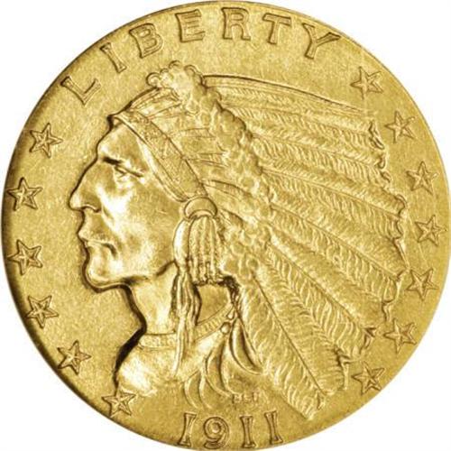 <B>1911-D $2 1/2 MS62 NGC.</B></I> After "buy the book, not the coin," one of the most frequently dispensed pieces of numismatic advice is "buy the key dates first." The logic is that the most challenging issues are the ones most likely to appreciate in value, and that purchasing the most elusive coins first can avoid a common pitfall: the nearly-completed set that stays unfinished because the key date in the grade the collector wants is priced out of reach.<BR> For the collector wishing to buy the key first and set the tone for his or her future set (or the one who took the opposite route), this 1911-D is a strong candidate. The sun-gold surfaces are luminous with a touch of satin, and the devices are well-defined. Light abrasions on and near the portrait account for the grade, though the overall visual appeal is strong.<BR><BR><B>Coin Engraver:</B> Bela Lyon Pratt<BR><BR><b>Shipping:</b> Coins & Currency (<a target="_blank" href="http://www.heritageauctions.com/common/shipping.php">view shipping information</a>)