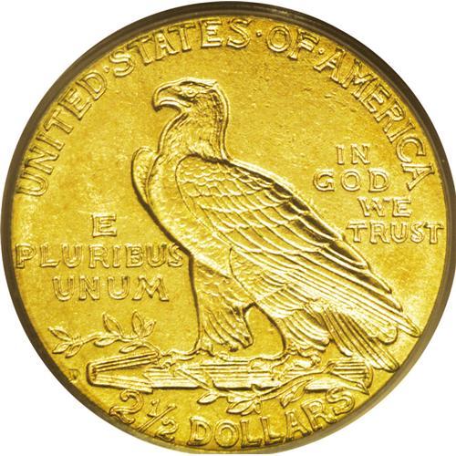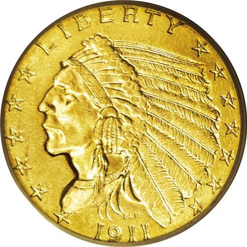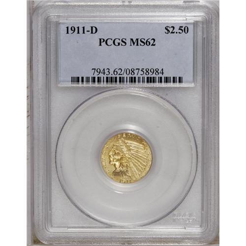 <B>1911-D<$2 1/2> MS62 PCGS.</B></I> The 1911-D Indian quarter eagle was produced in a very limited quantity that totaled just 55,680 coins. The next closest mintage in the entire series was 1914 with 240,000 pieces coined. All other dates had much higher mintages with 1913 serving as the high-water mark with a production of 722,000 coins. Although quite a number of these 1911-D quarter eagles survive, it is important to realize that many were struck with an extremely weak D mintmark, thus those examples with a bold mintmark such as this piece, are even rarer than the mintage figures might suggest. This piece is a lovely Mint State example with sharp design details and brilliant light yellow-gold luster.