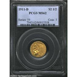 1911-D $2 1/2 MS62 PCGS. The 1911-D has the lowest mintage of any 20th century Quarter Eagle with only 55,680 pieces struck. It is the key to the Indian Quarter Eagle series and is seldom located in problem-free, lower Uncirculated condition. This piece is well struck and shows sparkling, matte-like surfaces that are surprisingly clean for an MS62. Important notice: We expect to be auctioning lots at the rate of 200-250 per hour. Sometimes eBay Premier live bid software cannot keep up with that pace, so we strongly recommend that you place a realistic proxy bid now as insurance to avoid disappointment. Also please note that all Heritage/CAA lots purchased through eBay Premier carry a 20% Buyer's Premium. Please make sure you read the Terms and Conditions.