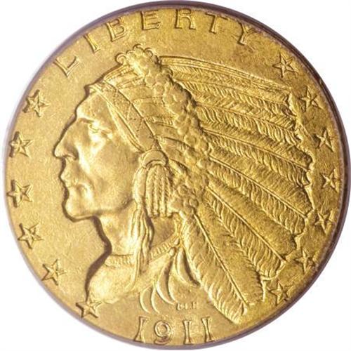 <B>1911-D $2 1/2 MS62 PCGS.</B></I> The Denver Mint made its first quarter eagles in 1911, the same year that it struck its first cents. While the facility churned out more than 12 million of the bronze pieces that year, it struck just 55,600 of the gold coins, which created a key issue that remains popular to this day.<BR> The surfaces of this pleasing piece are predominantly yellow-gold with a touch of wheat color on the obverse and orange overtones on the reverse. The well-defined devices are primarily mark-free, though the reverse fields display a handful of abrasions, including one that extends from the back of the eagle's neck to the I in IN. This desirable example displays beautifully and would fit well in a date set with similarly graded pieces.<BR><BR><b>Shipping:</b> Coins & Currency (<a target="_blank" href="http://www.heritageauctions.com/common/shipping.php">view shipping information</a>)