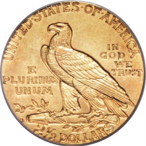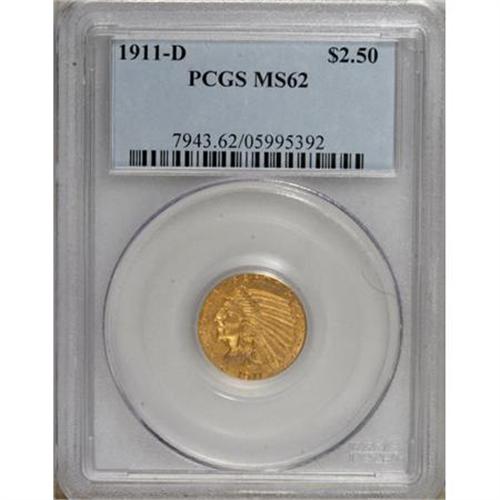 <B>1911-D $2 1/2 MS62 PCGS.</B></I> The 1911-D has a small mintage of just 55,680, far and away the lowest mintage of any Indian Head quarter eagle struck from 1908 through 1929. This modest quality Mint State piece displays apricot-gold patination imbued with faint hints of gray-green. Lustrous surfaces have satiny texture and exhibit sharp design features, including good definition in the headdress and the eagle's plumage. Many examples of this date are circulated or impaired, thus the present Mint State piece provides an important opportunity to the advanced collector.<BR><BR><B>Coin Engraver:</B> Bela Lyon Pratt<BR><BR><b>Shipping:</b> Coins & Currency (<a target="_blank" href="http://www.heritageauctions.com/common/shipping.php">view shipping information</a>\)