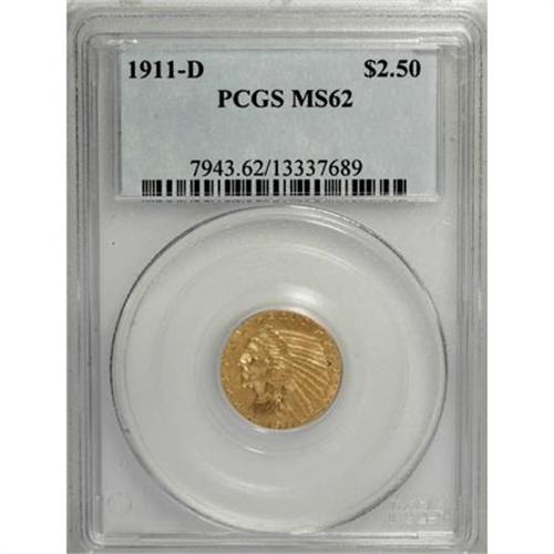 <B>1911-D $2 1/2 MS62 PCGS.</B></I> All of the 1911-D gold coin issues, the eagle and half eagle as well as the quarter eagle, are rare key-date issues within their respective series, due to the initial low mintages and subsequent minimal numbers of high-grade survivors. This piece features a bold mintmark, with pretty, deep orange-gold coloration and a tinge of hazel on the Indian's cheek. The surfaces on both sides are remarkably free of mentionable marks, save for a couple of hair-thin slide marks also visible on the Indian's cheek. An appealing example of this always-popular coin.<BR><BR><B>Coin Engraver:</B> Bela Lyon Pratt<BR><BR><b>Shipping:</b> Coins & Currency (<a target="_blank" href="http://www.heritageauctions.com/common/shipping.php">view shipping information</a>)