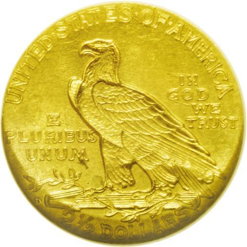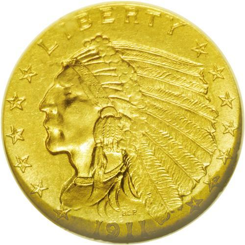 <B>1911-D<$2 1/2> MS63 NGC.</B></I> Most coinage series have their key-date issues, because the acquisition of such a coin unlocks the door to a complete set of coinage. Famous examples of key-date coins are the 1856 Flying Eagle cent, the 1877 Indian cent, the 1909-S V.D.B. Lincoln cent, the 1916 quarter, and the 1893-S dollar. In the Indian quarter eagle series, of course, it is the 1911-D rarity, with a mintage of just 55,680 coins. In his <I>Complete Encyclopedia,</B></I> Walter Breen commented: "All 15 date-mintmark combinations of this design were coined in large enough quantities to insure their permanent availability at a price, the only difficult one being 1911-D. This last has accordingly been touted as a 'key coin'--one the collector must reach for if (s)he wishes to complete a set." This example, a lovely Select quality Mint State coin, has sharp design elements and satiny honey-gold coloration. The mintmark is boldly visible, unlike many examples of the date.