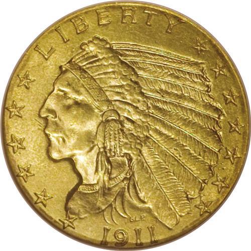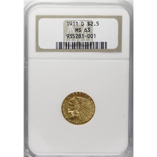 <B>1911-D $2 1/2 MS63 NGC.</B></I> The Denver mintmark is bold on this shimmering key date quarter eagle. The fields are surprisingly unabraded for the MS63 level, and the strike on the headdress is sharp for the type. A wire rim is present on the obverse between 10 and 5 o'clock. A reverse wire rim is even more prominent, between 3 and 11 o'clock. The low mintage 1911-D is the number one item on the want lists of most Indian quarter eagle collectors, and there are many of these, since the series is affordably obtained by date and mintmark relative to the other 20th century gold denominations. Most collectors end up with a circulated example, but here is an opportunity to secure a lustrous problem-free Mint State piece.<BR><BR><b>Shipping:</b> Coin/Currency (<a target="_blank" href="http://www.heritageauctions.com/common/shipping.php">view shipping information</a>)