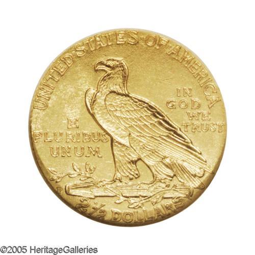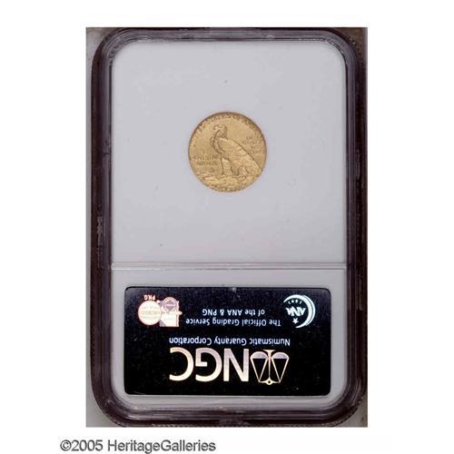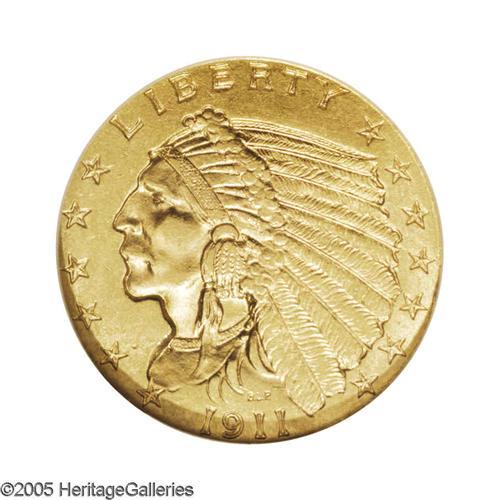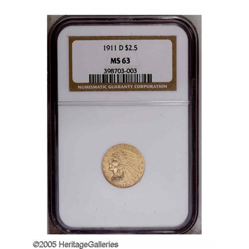 <B>1911-D<$2 1/2> MS63 NGC.</B></I> This is an exceptionally attractive Indian quarter eagle, regardless of date. The fact that it is an '11-D makes it all the more special. Strongly struck on both sides with a well formed mintmark, the surfaces are exceptionally clean for the grade and show rich red-golden color. For pedigree purposes, a small horizontal mark is visible in the reverse field above IN GOD WE TRUST. An attractive Select example of this scarce, key date issue.