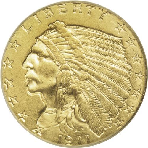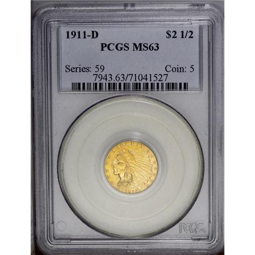 <B>1911-D $2 1/2 MS63 PCGS.</B></I> A lovely example of this key date Indian quarter eagle, which has by far the lowest mintage of the series. This important Select representative displays a good strike with a sharply defined mintmark and uncommonly smooth surfaces. The demand for this issue is considerable, as the Indian quarter eagle series is the only one that can be reasonably completed by date and mintmark.