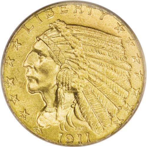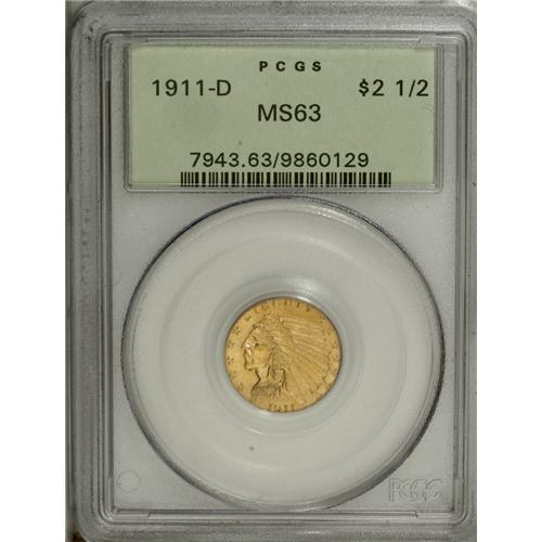 <B>1911-D $2 1/2 MS63 PCGS.</B></I> A pronounced wire rim on the upper right obverse helps to confirm that this Select Mint State specimen is a genuine example of the key date 1911-D quarter eagle. Boldly struck and satiny, the coin displays lovely reddish honey-gold toning which is brightly illuminated by effulgent luster. Unlike most MS63 pieces, this one is near-pristine and seems to lack even the smallest of surface blemishes on either side. For the sake of accuracy, we note a small prooflike area below TRUST, near the lower right reverse rim. We hasten to add that this feature is not overly detracting, and that it should not have influenced the technical grade of the piece. Housed in a green label holder.<BR><BR><b>Shipping:</b> Coin/Currency (<a target="_blank" href="http://www.heritageauctions.com/common/shipping.php">view shipping information</a>)