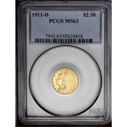 <B>1911-D<$2 1/2> MS63 PCGS.</B></I> A sharply struck example of the key Indian quarter eagle issue. The fully visible and sharpy defined mintmark on the reverse is an important collecting consideration as many of the 55,600 coins struck had weakly defined or perhaps invisible mintmarks. The present sale includes about half a dozen examples of this issue, and this example is one of the finest of those coins. Minor abrasions and faint hairlines limit the grade of this example. Both sides have satiny luster with appealing orange-gold coloration. <BR><BR><B>Important notice:</B> Heritage usually auctions material at the rate of 200-250 lots per hour. On some occasions eBay Live bid software or the Internet may not be able to keep up with the pace of the auction. We recommend placing a realistic absentee bid now as insurance to avoid disappointment. Occasionally the auctioneer may eliminate or reject an eBay Live bid, and the auctioneer may also reopen a lot after the close of the eBay live bidding (usually because we missed an audience bid), and may reject your bid even if it shows you as the winning bidder. By bidding via eBay Live, you agree that Heritage may award the lot to another bidder at its sole discretion under the circumstances described above or any other reasonable circumstances. Since eBay bids are not shown to us until we open the lot on the floor, we treat those bids just like floor bids. In most cases the floor responds before the eBay bid is presented to us, due to Internet lag time, so for consistency we have made it a policy that floor bids are always considered first over tie eBay live bids. Also please note that all Heritage lots purchased through eBay Live carry a 20% Buyer's Premium. Please make sure you read the Terms and Conditions before you bid. This lot is being auctioned in conjunction with a live floor auction by Heritage Galleries & Auctioneers. All final auction and invoice information will be supplied by Heritage Galleries & Auctioneers, and all other information should be considered preliminary. Lot:2487 <BR><BR><B>Winning Notification and Billing:</B> After the FINAL session in this auction is complete, Heritage will send e-mail and snail mail invoices. This process normally takes several days. All final auction and invoice information will be supplied by Heritage Galleries & Auctioneers, and all other information should be considered preliminary. <BR><BR>This auction will be conducted on a live auction floor and over the Internet through eBay Live. If you choose to place an absentee bid, please take a moment to <font color='#0000ff'><u><a href='http://pages.ebay.com/liveauctions/help/before/laabsentee.html'>learn how eBay Live absentee bidding works</a></u></font><font color='#000000'>