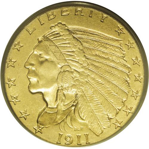 <B>1911-D<$2 1/2> MS63 PCGS.</B></I> Only 55,600 pieces were struck of the 1911-D, which makes it the undisputed key to the Indian quarter eagle series. As a general rule, collectors seldom assemble sets above MS63, even though higher graded pieces are occasionally available. A well-matched MS63 set is where most collectors top out, which again makes the 1911-D a key issue in terms of the present grade. This is a high-end example that shows very few abrasions for an MS63, especially an MS63 of this design type. The strike is strong throughout with detail to the top of the eagle's wing, and almost complete definition on the lowest feather of the headdress. Likewise, the mint luster is strong throughout with an even, satiny finish, and close examination reveals a subtle intermixture of lilac blended in with the overall reddish-golden color.