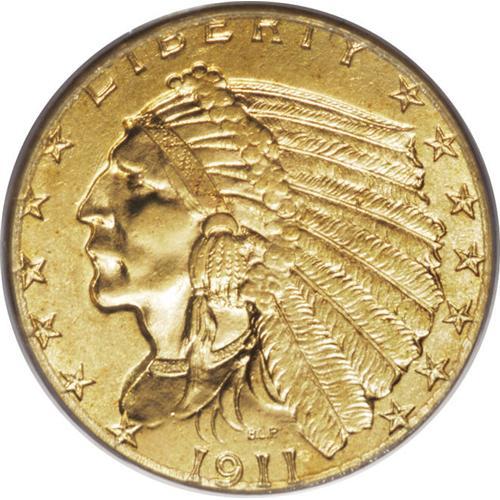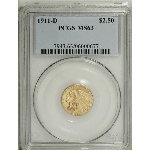 <B>1911-D $2 1/2 MS63 PCGS.</B></I> This satiny Mint State piece has nearly matte-like surfaces, especially on the reverse, providing excellent aesthetic appeal. The surfaces are pristine with few blemishes of any type, and a trace of honey-gold toning on the reverse adds to the overall presentation. Although several examples of this key-date issue are included in the present sale (like most of our sales), the majority of pieces are in lower grades than this example. Despite the offering of several pieces from one sale to the next, there never seem to be an overabundance of pieces on the market.<BR><BR><b>Shipping:</b> Coins & Currency (<a target="_blank" href="http://www.heritageauctions.com/common/shipping.php">view shipping information</a>)