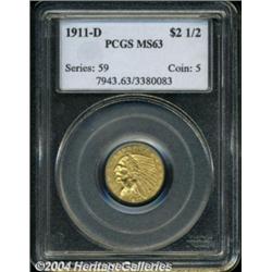 <table><tbody><tr><td><table> <TR><TD width="100%"><TABLE cellSpacing=1 cellPadding=3 width="100%" border=0><TBODY><TR><TD width="100%" bgColor=#79735c><FONT face=arial color=#ffffff size=3><B>Description</B> </FONT></TD></TR><TR><TD width="100%" bgColor=#ffffff><FONT face=arial size=2><B>1911-D $2 1/2 MS63 PCGS.</B></I> A bright and quite lustrous example of this popular key to the Indian Quarter Eagle series. The diagnostic wire rim is bold on the right side of the obverse, and there are surprisingly few marks for the assigned grade. Certainly a worthwhile, Select specimen representing this highly collectible key date in the Indian Quarter Eagle series. </FONT></TD></TR></TBODY></TABLE></TD></TR></TBODY></TABLE><BR><A name=PricesRealized></A><TABLE cellSpacing=0 cellPadding=0 width="100%" bgColor=#000000 border=0><TBODY><TR><TD width="100%"><TABLE cellSpacing=1 cellPadding=3 width="100%" border=0><TBODY><TR><TD width="100%" bgColor=#79735c><A name=PR><FONT face=arial color=#ffffff size=3><B>Previous Prices from Heritage Auctions</B> </FONT></A></TD></TR><TR><TD bgColor=#f6f6ed><TABLE cellSpacing=0 cellPadding=0 width="100%" border=1><TBODY><TR><TD align=middle width="33%"><B>Date</B></TD><TD align=middle width="33%"><B>Service</B></TD><TD align=middle width="33%"><B>Price</B></TD></TR><TR bgColor=whitesmoke><TD width="33%"><B>07/15/2003</B></TD><TD width="33%">PCGS</TD><TD width="33%">$12,650.00</TD></TR><TR bgColor=whitesmoke><TD width="33%"><B>01/07/2004</B></TD><TD width="33%">NGC</TD><TD width="33%">$19,550.00</TD></TR><TR bgColor=whitesmoke><TD width="33%"><B>01/12/2002</B></TD><TD width="33%">PCGS</TD><TD width="33%">$10,350.00</TD></TR><TR bgColor=whitesmoke><TD width="33%"><B>05/31/2001</B></TD><TD width="33%">PCGS</TD><TD width="33%">$9,027.50</TD></TR><TR bgColor=whitesmoke><TD width="33%"><B>06/01/1996</B></TD><TD width="33%">NGC</TD><TD width="33%">$5,500.00</TD></TR><TR bgColor=whitesmoke><TD width="33%"><B>06/01/2000</B></TD><TD width="33%">PCGS</TD><TD width="33%">$6,900.00</TD></TR><TR bgColor=whitesmoke><TD width="33%"><B>10/02/2000</B></TD><TD width="33%">PCGS</TD><TD width="33%">$7,187.00</TD></TR><TR bgColor=whitesmoke><TD width="33%"><B>03/01/2000</B></TD><TD width="33%">NGC</TD><TD width="33%">$7,475.00</TD></TR><TR bgColor=whitesmoke><TD width="33%"><B>11/01/1999</B></TD><TD width="33%">PCGS</TD><TD width="33%">$7,425.00</TD></TR><TR bgColor=whitesmoke><TD width="33%"><B>01/01/1995</B></TD><TD width="33%">PCGS</TD><TD width="33%">$6,600.00</TD></TR><TR bgColor=whitesmoke><TD width="33%"><B>03/01/1998</B></TD><TD width="33%">NGC</TD><TD width="33%">$5,280.00</TD></TR></TBODY></TABLE></TD></TR><TR><TD bgColor=#ffffff><FONT face=arial size=1 ?>PLEASE NOTE: All prices realized reflect the final hammer price PLUS the buyer's premium in auctions that charge a buyer's premium. Each item has a notation at the top of the listing indicating whether that lot included a buyer's premium. Example: A item that sells with a final hammer price of $100 and a 20% buyer's premium will display with a price realized of $120. All information listed is intended to be as accurate as possible, but errors are possible. Please use this guide carefully and inform us of any inaccuracies. </FONT></TD></TR></TBODY></TABLE></TD></TR></TBODY></TABLE><BR><TABLE cellSpacing=0 cellPadding=0 width="100%" bgColor=#000000 border=0><TBODY><TR><TD width="100%"><TABLE cellSpacing=1 cellPadding=3 width="100%" border=0><TBODY><TR><TD width="100%" bgColor=#79735c colSpan=6><FONT face=arial color=#ffffff size=3><B>Price Guide*</B> </FONT></TD></TR><TR bgColor=#f6f6ed><TD align=middle><B>Grade</B> </TD><TD align=middle><B>Coin World<BR>(Trends)</B> </TD><TD align=middle><B>Numismedia<BR>Retail</B> </TD><TD align=middle><B>Numismedia<BR>Wholesale</B> </TD><TD align=middle><B>Coin<BR>Universe</B> </TD><TD align=middle><B>Heritage<BR>Value Index</B> </TD></TR><TR bgColor=#ffffff><TD align=middle>62</TD><TD align=right>$10,000.00</TD><TD align=right>---</TD><TD align=right>$6,875.00</TD><TD align=right>$10,000.00</TD><TD align=right>$8,382.50</TD></TR><TR style="FONT-WEIGHT: bold" bgColor=#cccfdd><TD align=middle>63</TD><TD align=right>$23,000.00</TD><TD align=right>---</TD><TD align=right>$12,500.00</TD><TD align=right>$21,500.00</TD><TD align=right>$15,375.00</TD></TR><TR bgColor=#ffffff><TD align=middle>64</TD><TD align=right>$30,000.00</TD><TD align=right>---</TD><TD align=right>$18,750.00</TD><TD align=right>$30,000.00</TD><TD align=right>$21,437.50</TD></TR><TR bgColor=#ffffff><TD colSpan=6><FONT size=1>*All information listed is intended to be as accurate as possible, but errors are possible. No item may be returned or refused based on this information which is provided as a service to our customers. You should contact each pricing source directly to determine the accuracy of this information. </FONT></TD></TR></TBODY></TABLE></TD></TR></TBODY></TABLE><BR><TABLE cellSpacing=0 cellPadding=0 width="100%" bgColor=#000000 border=0><TBODY><TR><TD width="100%"><TABLE cellSpacing=1 cellPadding=3 width="100%" border=0><TBODY><TR><TD width="100%" bgColor=#79735c><FONT face=arial color=#ffffff size=3><B>Population Guide</B> </FONT></TD></TR><TR bgColor=#ffffff><TD align=middle><!-- Begin Output of Population Grid--><TABLE cellSpacing=0 cellPadding=0 width="100%" border=0><TBODY><TR><TD vAlign=center><TABLE cellSpacing=0 width="100%" border=1 cellsadding="3"><TBODY><TR><TD vAlign=center><TABLE cellSpacing=0 cellPadding=3 width="100%" border=1><TBODY><TR><TD vAlign=center align=middle bgColor=#f0f1e8 colSpan=2 <CENTER><FONT face=Arial size=2><B>PCGS Pop </B></FONT><CENTER></CENTER></TD><TD vAlign=center align=middle bgColor=#f0f1e8 colSpan=2><CENTER><FONT face=Arial size=2><B>NGC Pop</B></CENTER></FONT></TD></TR><TR><TD vAlign=center><FONT face=Arial size=2>(63)</FONT> </TD><TD vAlign=center align=right><FONT face=Arial size=2>230</FONT> </TD><TD vAlign=center><FONT face=Arial size=2>(63)</FONT> </TD><TD vAlign=center 