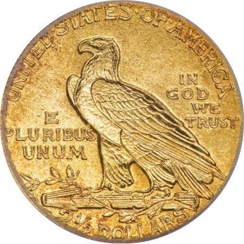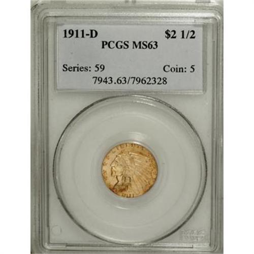 <B>1911-D $2 1/2 MS63 PCGS.</B></I> Paul Green, in a September 17, 1996 <I>Numismatic News</B></I> article entitled "Don't Overlook Indian Head Quarter Eagles," writes of the key date 1911-D: "It has not become any more common over the years. It always has, and always will be the key date in the Indian Head quarter eagle set. Its prices routinely run four or five times higher than the prices of common dates. None question that it is the key date to the set and worth the price."<BR> The Select example offered in this lot displays a blend of peach and reddish-gold patina that rests on bright luster. A well executed strike leaves its mark on the design elements that are quite well defined; only the eagle's shoulder exhibits some softness, and it is quite minor. Magnification reveals a few minute marks, but these do not significantly detract from the overall appeal of this pleasing example.<BR><BR><B>Coin Engraver:</B> Bela Lyon Pratt<BR><BR><b>Shipping:</b> Coins & Currency (<a target="_blank" href="http://www.heritageauctions.com/common/shipping.php">view shipping information</a>)