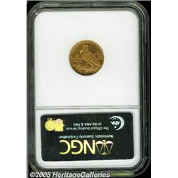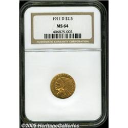 <B>1911-D $2 1/2 MS64 NGC.</B></I> The undisputed key to this series, the 1911-D Indian Head Quarter Eagle has long been a favorite among collectors both because of its remarkably low mintage of just 55,680 pieces and its rarity in high grades. Most often seen in EF and AU grades, this issue is very scarce in the higher Mint State grades and is seldom offered above the MS64 grade. This example shows the diagnostic wire rim on the right side of the obverse, and the mint mark is bold and well formed. It is sharply struck on both sides, clearly showing all of the feather details on both the Indian's headdress and on the eagle, and displays only a few light, scattered abrasions that are consistent with the near-Gem grade. One tiny spot is noticed under the G of GOD above the eagle's wing, and is mentioned for accuracy and as a potential aid for pedigree information.