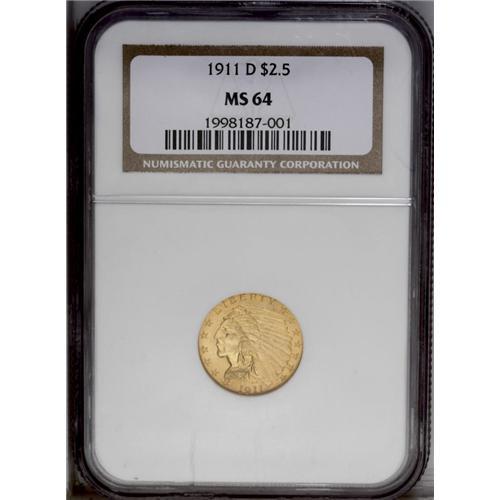 <B>1911-D<$2 1/2> MS64 NGC.</B></I> This impressive near-Gem example has fully brilliant satin luster with lovely yellow-gold color. In his <I>A Handbook of 20th-Century United States Gold Coins,</B></I> renowned gold coinage authority David Akers commented: "The 1911-D is the rarest date of the series in all grades from circulated to Gem Uncirculated. Most known examples are in the lower Mint State grades, and obtaining one in MS-60 to 62 condition can usually be accomplished with only a little searching. However, in MS-63 condition this issue is seldom available, and anything better than MS-63 is extremely difficult to locate." Like many of our sales, the present auction provides the collector with a rare opportunity to choose just the right example from multiple specimens in a range of grades. Be certain to choose a piece with a bold mintmark, such as this example, for others with a weak mintmark are clearly less desirable.