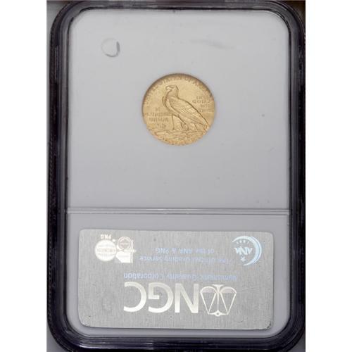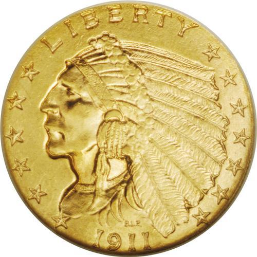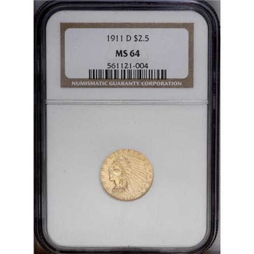 <B>1911-D $2 1/2 MS64 NGC.</B></I> Within the entire panorama of American numismatics, it seems that every series has its key-date issue or issues. In the case of Indian quarter eagles, the '11-D is the key-date coin. The surfaces of this example are fully lustrous and frosty, and all of the design features are boldly rendered. Both sides have light yellow-gold color. The mintmark is much sharper than usual for this issue. This Choice Mint State example is about as fine as one could expect for the issue. PCGS and NGC have combined to certified a mere 73 finer examples of the date. Census: 322 in 64, 56 finer (1/06).