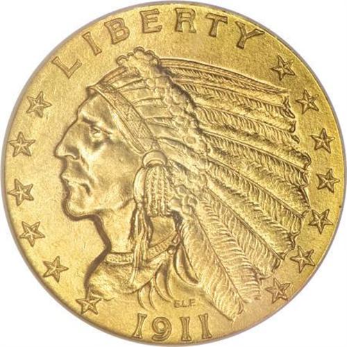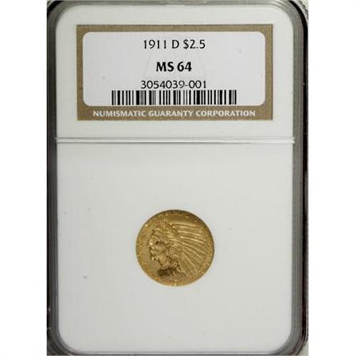<B>1911-D $2 1/2 MS64 NGC.</B></I> The 1911-D Indian quarter eagle requires little introduction. Even novice collectors of non-gold coins understand the significance of this low mintage two and a half dollar piece. However, certain high grade examples of this key date issue do warrant a healthy amount of boasting, and the current coin is one such piece. The satiny luster seems to intensify the straw-gold coloration of both sides, which are also well struck. The mintmark is especially strong, which is obviously the highlight on this issue. Without the aid of magnification, the surfaces appear to be free of abrasions, and even when examined under a loupe the marks are inconsequential, or at the very least commensurate with the assigned grade. A pleasing coin not only due to its status as a key date, but also in terms of eye appeal.<BR><BR><B>Coin Engraver:</B> Bela Lyon Pratt<BR><BR><b>Shipping:</b> Coins & Currency (<a target="_blank" href="http://www.heritageauctions.com/common/shipping.php">view shipping information</a>)
