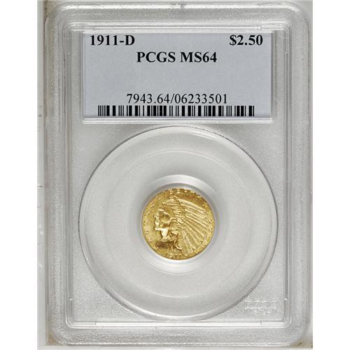<B>1911-D<$2 1/2> MS64 PCGS.</B></I> The 1911-D quarter eagle is a favorite among collectors, and we always try to provide a nice selection in each of our auctions, and the present sale is no exception. Only the 1914 and 1914-D quarter eagles can rival this issue for high-grade rarity, although the much more plentiful 1912 issue is similarly rare in top quality. Examples of this date that grade Choice Mint State or MS64 on the numerical scale represent the best quality that can be obtained without undue difficulty as Gem quality pieces are extremely rare. This satiny near-Gem has full luster, sharp design definition, and brilliant honey-gold surfaces. Both sides are pristine and aesthetically desirable.