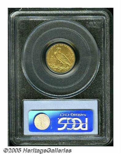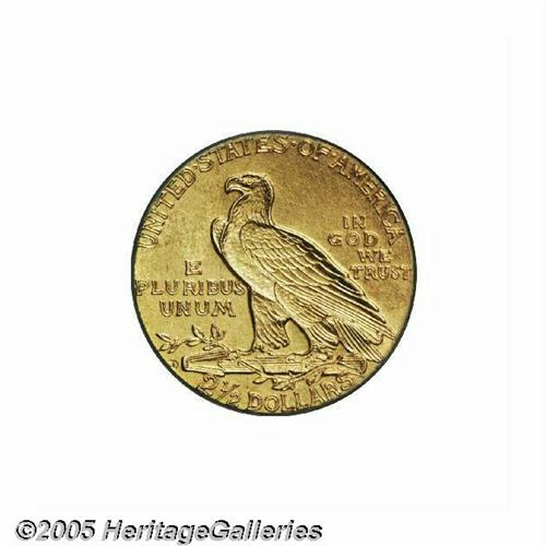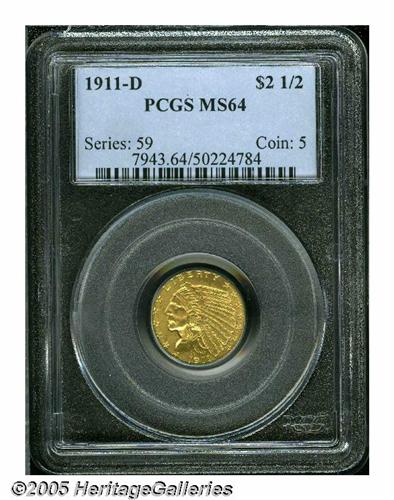 <B>1911-D<$2 1/2> MS64 PCGS.</B></I> The 1911-D quarter eagle is the widely recognized key to the Indian quarter eagle series. A mere 55,600 pieces were minted and the vast majority of survivors are only found in XF-AU condition today. This piece has a sharply impressed mintmark, which is a real plus on this issue as so many coins have a mushy, indistinct D. In addition to the sharp mintmark, the design elements are strongly brought up on each side with above average definition on the lowest feather of the headdress and complete feather details at the top of the eagle's wing. Smooth, satiny mint luster covers each side and there are no mentionable or detracting marks in the fields, as usually seen on Indian quarter eagles.