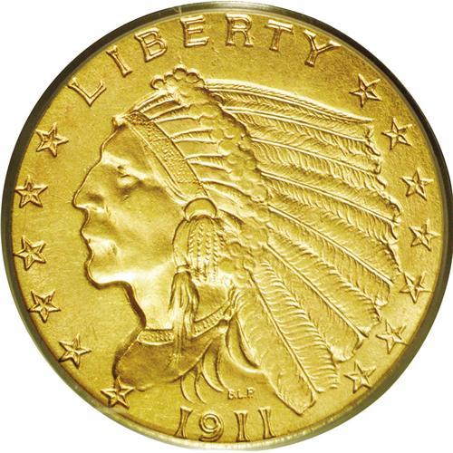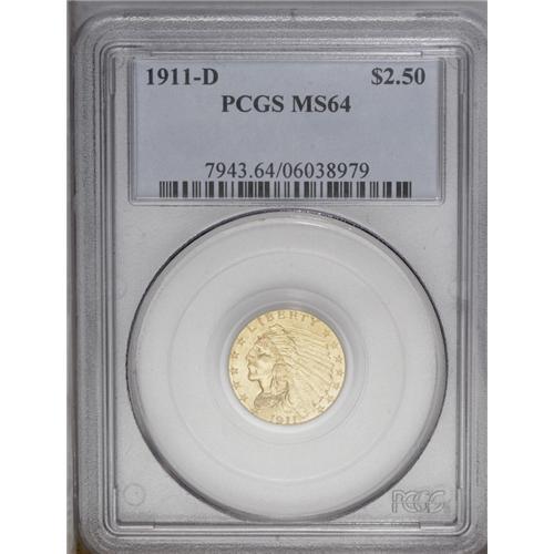 <B>1911-D<$2 1/2> MS64 PCGS.</B></I> The first of only three mintmarked issues in the 1908-1929 Indian quarter eagle series, the 1911-D is by far the rarest. It is always a pleasure to offer a near-Gem representative of this important issue. Copper-gold in color, both sides also exhibit faint tan-gold undertones. No often-seen alloy spots are present, nor can we find more than a few trivial reverse abrasions. Sharply struck with a crisp mintmark. Expect this coin to create significant competition between numismatists who specialize in high grade representatives of this widely collected series.