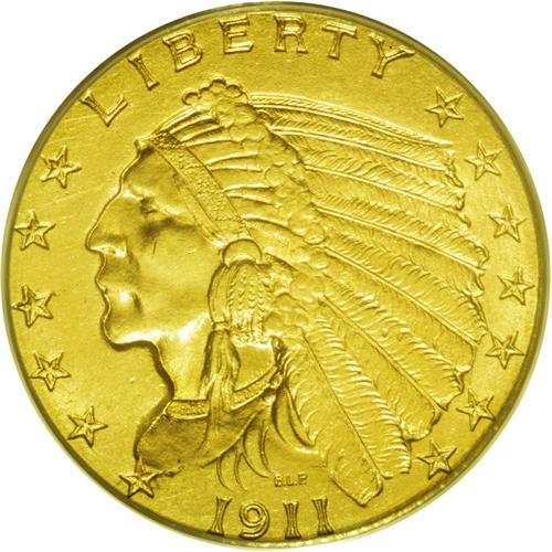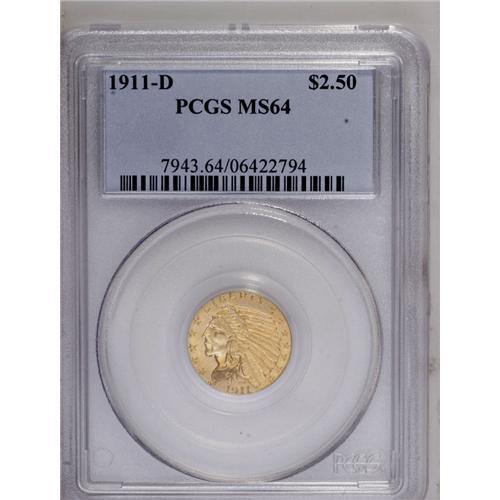<B>1911-D<$2 1/2> MS64 PCGS.</B></I> This important key date example boasts an excellent strike, including a completely defined mintmark. Displaying fine satiny luster and intermingled lime-green and orange-rose color, the only slight distractions are a wispy pinscratch connecting the date's last number 1 to the Indian's bust, and a small contact mark on the cheekbone. The diagnostic wire rim on the upper right obverse is very faint, but can be discerned using magnification.<BR> The original mintage of 55,680 pieces is the lowest among all 20th century quarter eagles, and represents the Denver Mint's first delivery of that denomination. It is also the only Indian quarter eagle issue with a mintage of less than 100,000 pieces. This outstanding near-Gem representative, then, must be considered in the context of overall scarcity, which can be anticipated to a certain degree based upon mintage, but also requires an examination of survival in the better grades of Mint State. For the 1911-D, this survival rate is respectable but not spectacular by any means, as the issue was clearly not saved from circulation in great numbers. Thus, although several hundred pieces have attained the MS64 grade assessment, and are therefore somewhat attainable to the collecting public, far fewer examples are known at the Gem level of preservation or finer, making Gems and Premium Gems simply unaffordable, for most. Considering the paucity of higher-graded specimens, it seems likely that a fine near-Gem like this one should draw serious attention from any number of potential buyers.