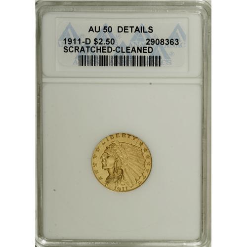 <B>1911-D $2 1/2 --Scratched, Cleaned--ANACS. AU50 Details.</B></I> A trio of thin scratches are present on the obverse near 1 o'clock, and both sides are lightly hairlined and a bit bright. Nonetheless, this bold key date quarter eagle has minimal wear, and the all-important Denver mintmark is clearly defined.<BR><BR><b>Shipping:</b> Coins & Currency (<a target="_blank" href="http://www.heritageauctions.com/common/shipping.php">view shipping information</a>)