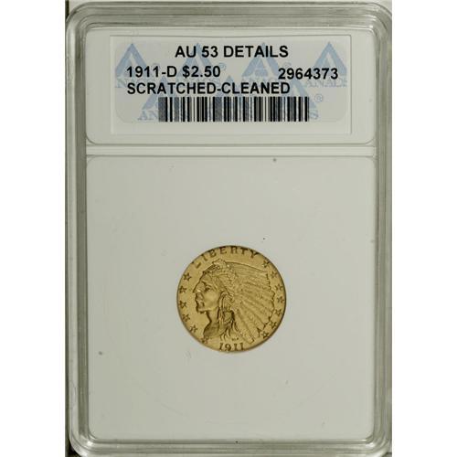 <B>1911-D $2 1/2 --Scratched, Cleaned--ANACS. AU53 Details.</B></I> A lightly worn example of this well-known quarter eagle issue, solidly defined overall with a distinct mintmark. The hazy mustard-gold surfaces exhibit considerable gloss, while minor hairlines surround two parallel scratches that appear to the left of the eagle. Interesting and important despite a slight degree of impairment.<BR><BR><b>Shipping:</b> Coins & Currency (<a target="_blank" href="http://www.heritageauctions.com/common/shipping.php">view shipping information</a>)