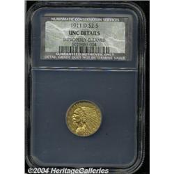<B>1911-D<$2 1/2> Unc Details, Improperly Cleaned, NCS.</B></I> The rich, yellow-gold surfaces are just a little too bright, the result of having been cleaned at one time. Minimally marked with good detail, an affordable example of this popular key. <BR><BR><B>Important notice:</B> Heritage usually auctions material at the rate of 200-250 lots per hour. On some occasions eBay Live bid software or the Internet may not be able to keep up with the pace of the auction. We recommend placing a realistic absentee bid now as insurance to avoid disappointment. Occasionally the auctioneer may eliminate or reject an eBay Live bid, and the auctioneer may also reopen a lot after the close of the eBay live bidding (usually because we missed an audience bid), and may reject your bid even if it shows you as the winning bidder. By bidding via eBay Live, you agree that Heritage may award the lot to another bidder at its sole discretion under the circumstances described above or any other reasonable circumstances. Since eBay bids are not shown to us until we open the lot on the floor, we treat those bids just like floor bids. In most cases the floor responds before the eBay bid is presented to us, due to Internet lag time, so for consistency we have made it a policy that floor bids are always considered first over tie eBay live bids. Also please note that all Heritage lots purchased through eBay Live carry a 20% Buyer's Premium. Please make sure you read the Terms and Conditions before you bid.