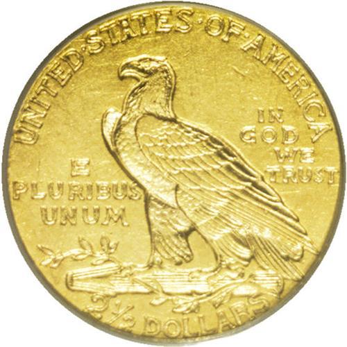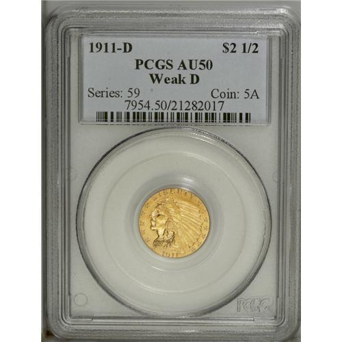 <B>1911-D $2 1/2 Weak D AU50 PCGS.</B></I> The Denver mintmark is indistinct to the unaided eye, but once viewed beneath a loupe, the entire mintmark is apparent. This lemon-tinted key date representative has slight friction on the cheekbone and other highpoints, but nearly all design details are intact.<BR><BR><b>Shipping:</b> Coin/Currency (<a target="_blank" href="http://www.heritageauctions.com/common/shipping.php">view shipping information</a>)