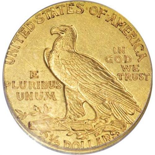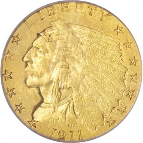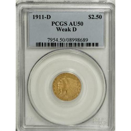 <B>1911-D $2 1/2 Weak D AU50 PCGS.</B></I> Like a number of representatives of this ever-popular key, the present piece shows only a ghost of a mintmark to the left of the arrowheads. This piece is well struck otherwise with warm orange-gold surfaces and occasional flecks of deeper color in the crevices of the design. Minimally marked with substantial eye appeal. Population: 14 in 50, 17 finer (7/07).<BR><BR><B>Coin Engraver:</B> Bela Lyon Pratt<BR><BR><b>Shipping:</b> Coins & Currency (<a target="_blank" href="http://www.heritageauctions.com/common/shipping.php">view shipping information</a>\)