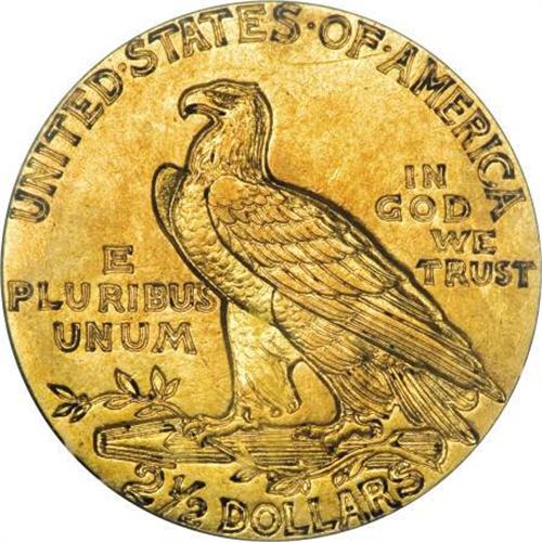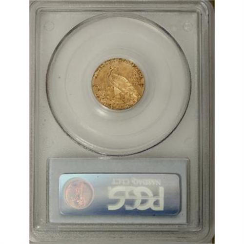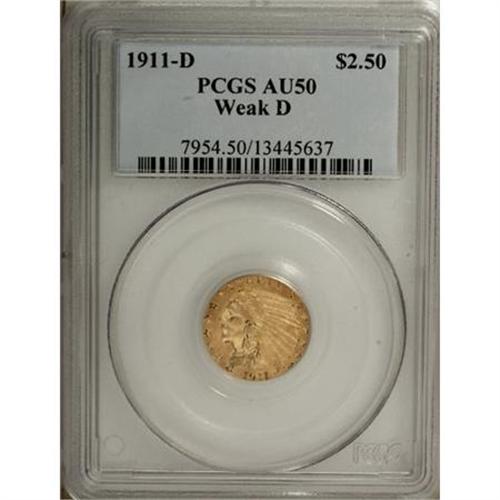 <B>1911-D $2 1/2 Weak D AU50 PCGS.</B></I> The Denver mintmark has minimal relief, but its outline is clear once viewed beneath a loupe. The low mintage 1911-D is the key to the series, particularly in circulated grades. This orange-gold example retains considerable luster and has impressively smooth surfaces.<BR><BR><B>Coin Engraver:</B> Bela Lyon Pratt<BR><BR><b>Shipping:</b> Coins & Currency (<a target="_blank" href="http://www.heritageauctions.com/common/shipping.php">view shipping information</a>)