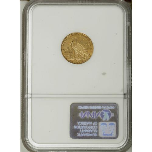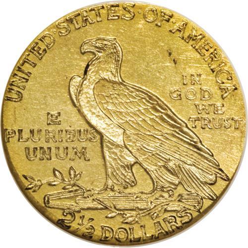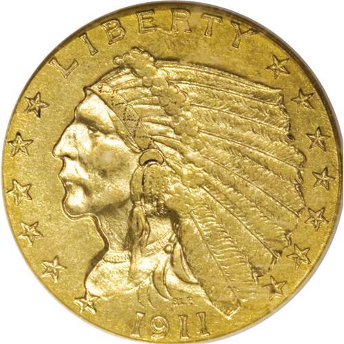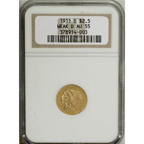 <B>1911-D $2 1/2 Weak D AU55 NGC.</B></I> A bit weakly struck and the mintmark is equally weak, but the surfaces of this coin appear to be completely original. Rich orange-gold and lilac patina cover each side. The only marks of note (magnification required) is a short one below the chin of the Indian on the obverse, and a shallow scrape in the upper right field above IN. The diagnostic wire rim on the right side of the obverse is plainly evident.<BR><BR><b>Shipping:</b> Coin/Currency (<a target="_blank" href="http://www.heritageauctions.com/common/shipping.php">view shipping information</a>)
