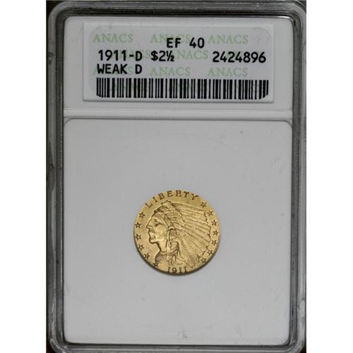 <B>1911-D<$2 1/2> Weak D XF40 ANACS.</B></I> A smooth khaki-gold representative that exhibits substantial definition within the headdress and eagle. The mintmark is extremely faint; personal inspection is suggested.