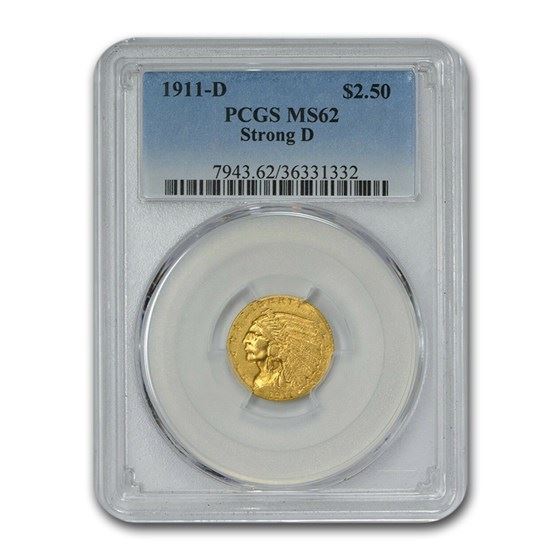 One piece 1911-D $2.50 Indian Gold Quarter Eagle MS-62 PCGS (Strong D)